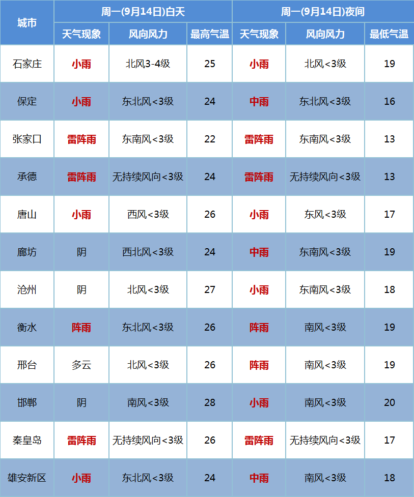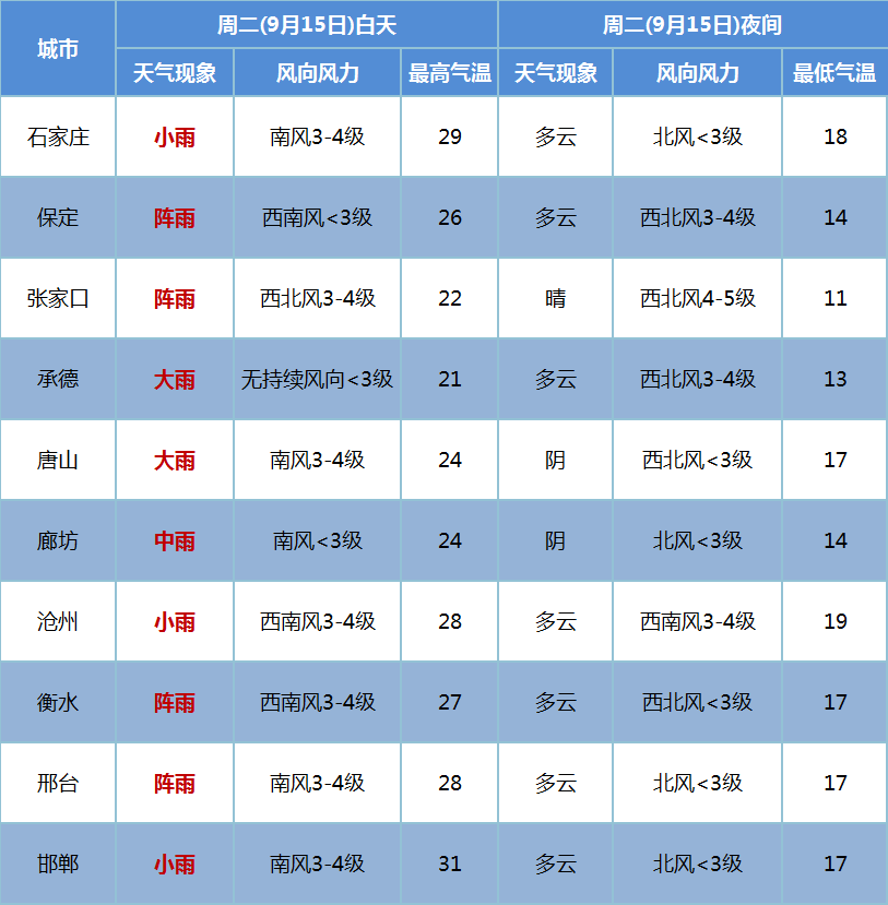 明天白天,张家口北部、承德北部、秦皇岛南部、唐山南部阴,沧州东部、衡水东部、邢台南部、邯郸阴有零星阵雨或阵雨,其他地区阴有阵雨,局地有中雨。