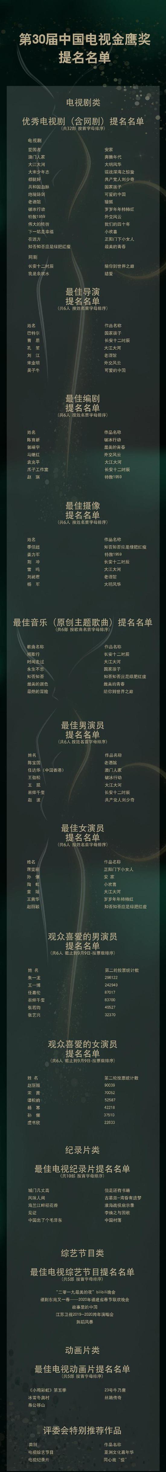 网易娱乐9月15日报道 9月15日,第30届中国电视金鹰奖提名名单揭晓,《大江大河》《都挺好》《猎狐》《破冰行动》《外交风云》《知否》《长安十二时辰》《陪你到世界之巅》《结爱》等电视剧(含网剧)入围;陈宝国、任达华、王劲松、王凯、易烊千玺、赵波共同角逐最佳男演员奖;蒋雯丽、孙俪、小陶虹、童瑶、王茜华、赵丽颖获最佳女演员提名。