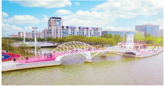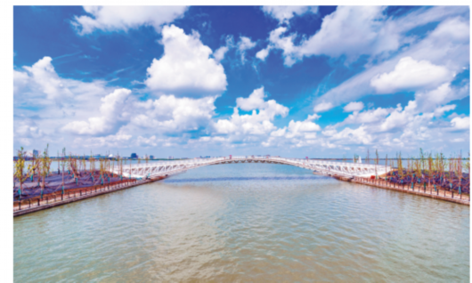 图片说明:A港桥“赤黾”,采用拱形结构,由白绿两色构成,桥体修长,4个支持物融入两岸绿地中,如同水面上的水黾一般轻盈地浮在两岸之间。