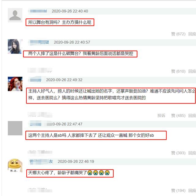 其实应该及时处理伤口的,有不少网友吐槽主持人临场应变太差了,没有第一时间查看身体情况送医院检查,捞人的时候还让喊出她的名字,还掌声鼓劲加油,搞得这么热情黄龄想走都不能走,最后坚持把歌唱完才送去医院的。