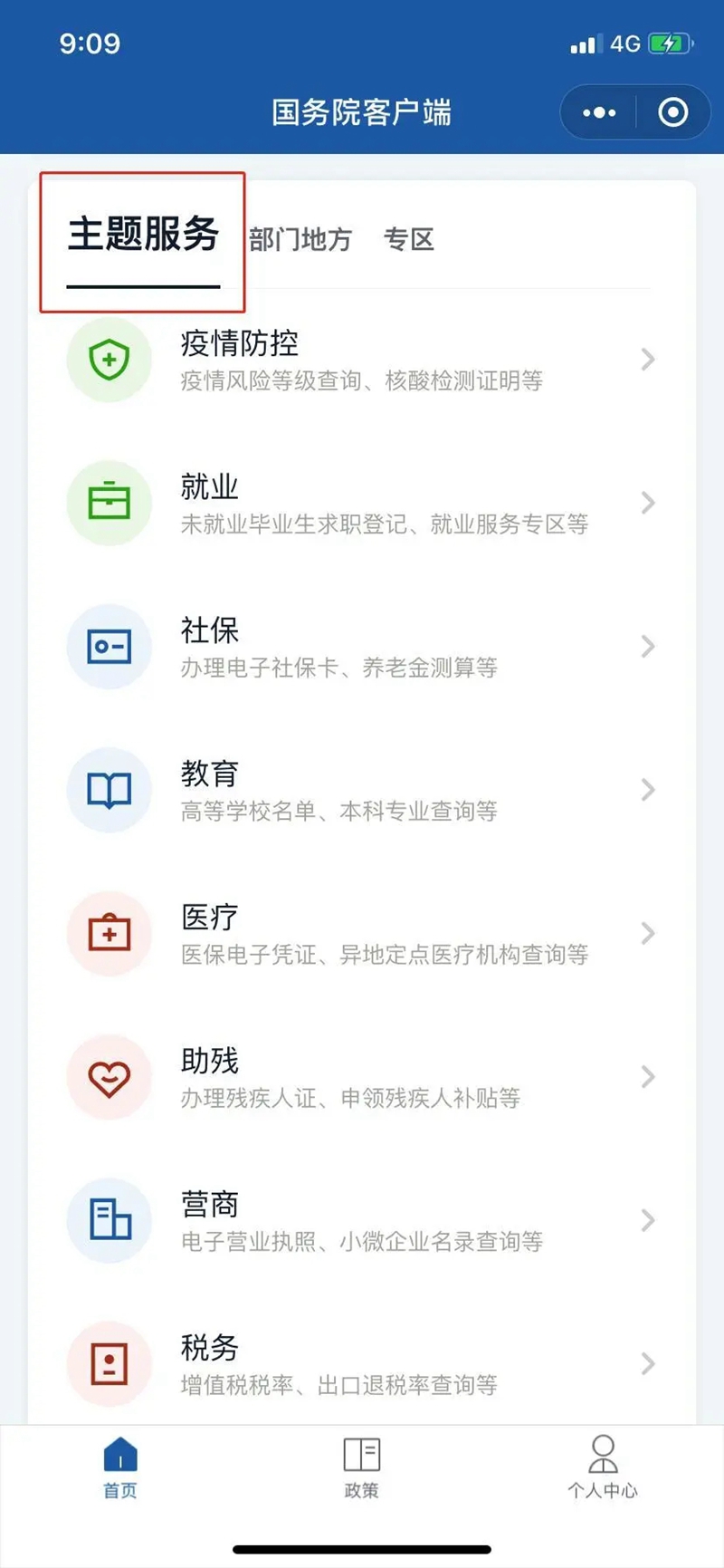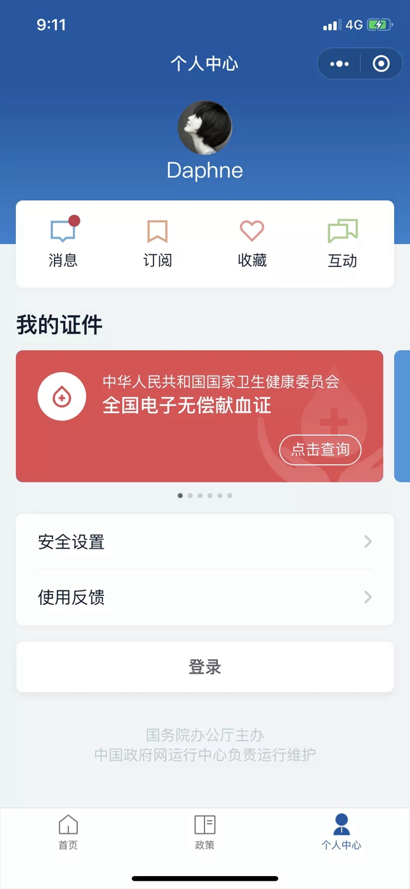 分设了首页、政策、个人中心三个频道。