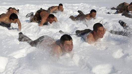 在零下22摄氏度的极寒天气,黑龙江边防官兵在雪地中进行抗寒训练,光着上半身匍匐前进。