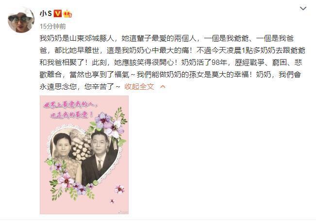 据了解,小S的爸爸于2012年10月23日因肝癌去世。当时白发人送黑发人。时隔8年,小S的奶奶也在10月离世。