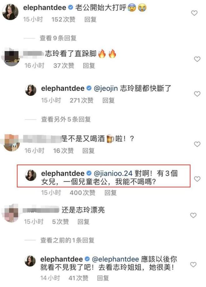 就小S在奶奶去世的前一天,因为老公打呼而睡不着的小S晒出一张素颜美照,照片中她的脸有些微红,似乎是又喝酒了。可能是睡不着太过无聊,小S在评论区与多名网友互动,被问到是否喝酒,她直爽回复称:“对啊,有3个女儿,一个儿童老公,我能不喝吗?”看来小S的生活还是挺辛苦的,要照顾四个人,难怪偶尔会借酒消愁放松一下。