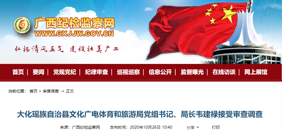 据河池市纪委监委消息:大化瑶族自治县文化广电体育和旅游局党组书记、局长韦建禄 因涉嫌严重违纪违法,目前正在接受河池市纪委监委纪律审查和监察调查。
