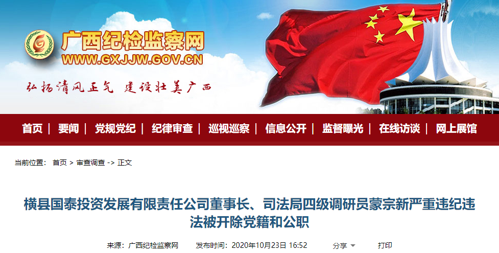 南宁横县国泰投资发展有限责任公司董事长、司法局四级调研员蒙宗新严重违纪违法被开除党籍和公职