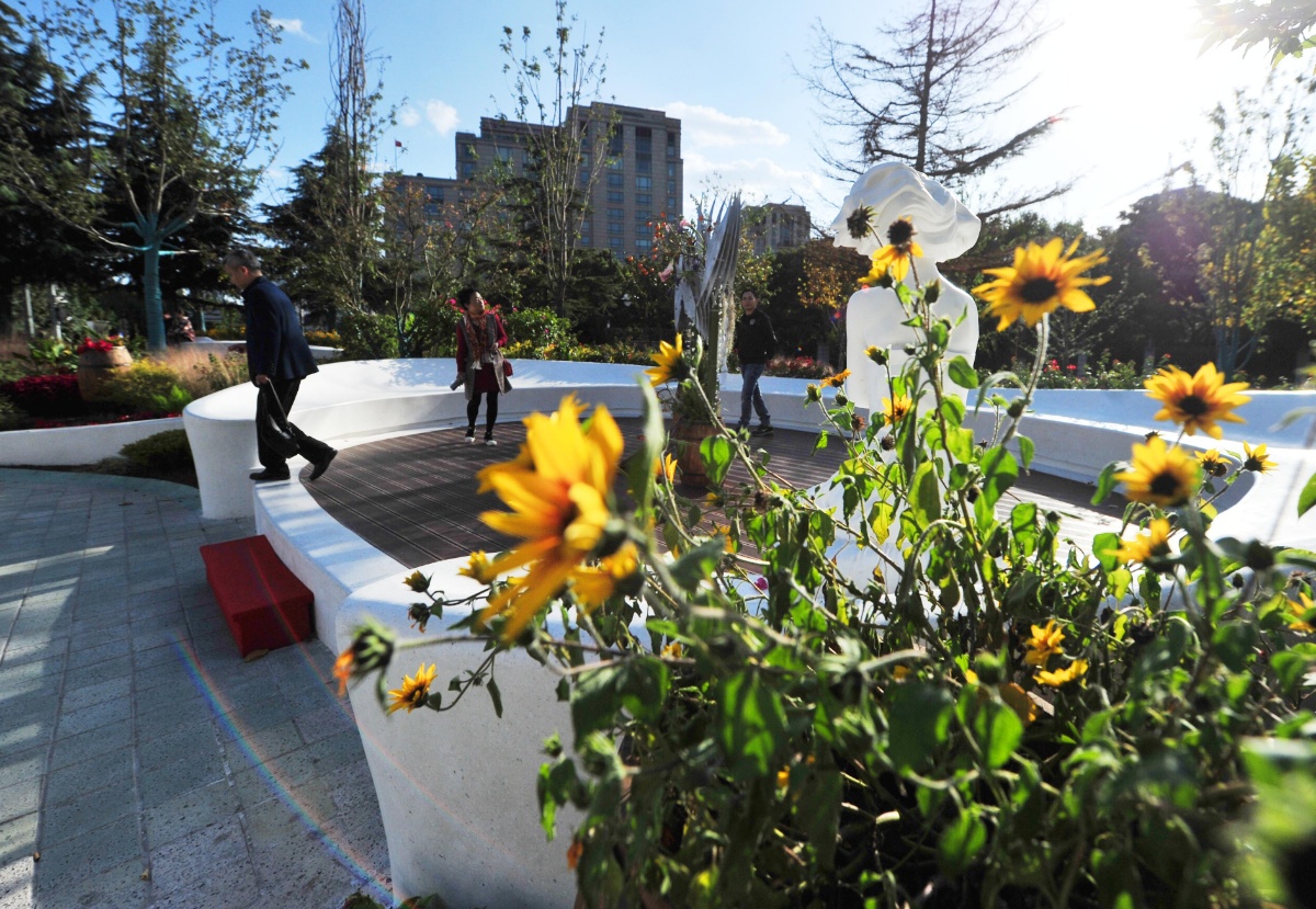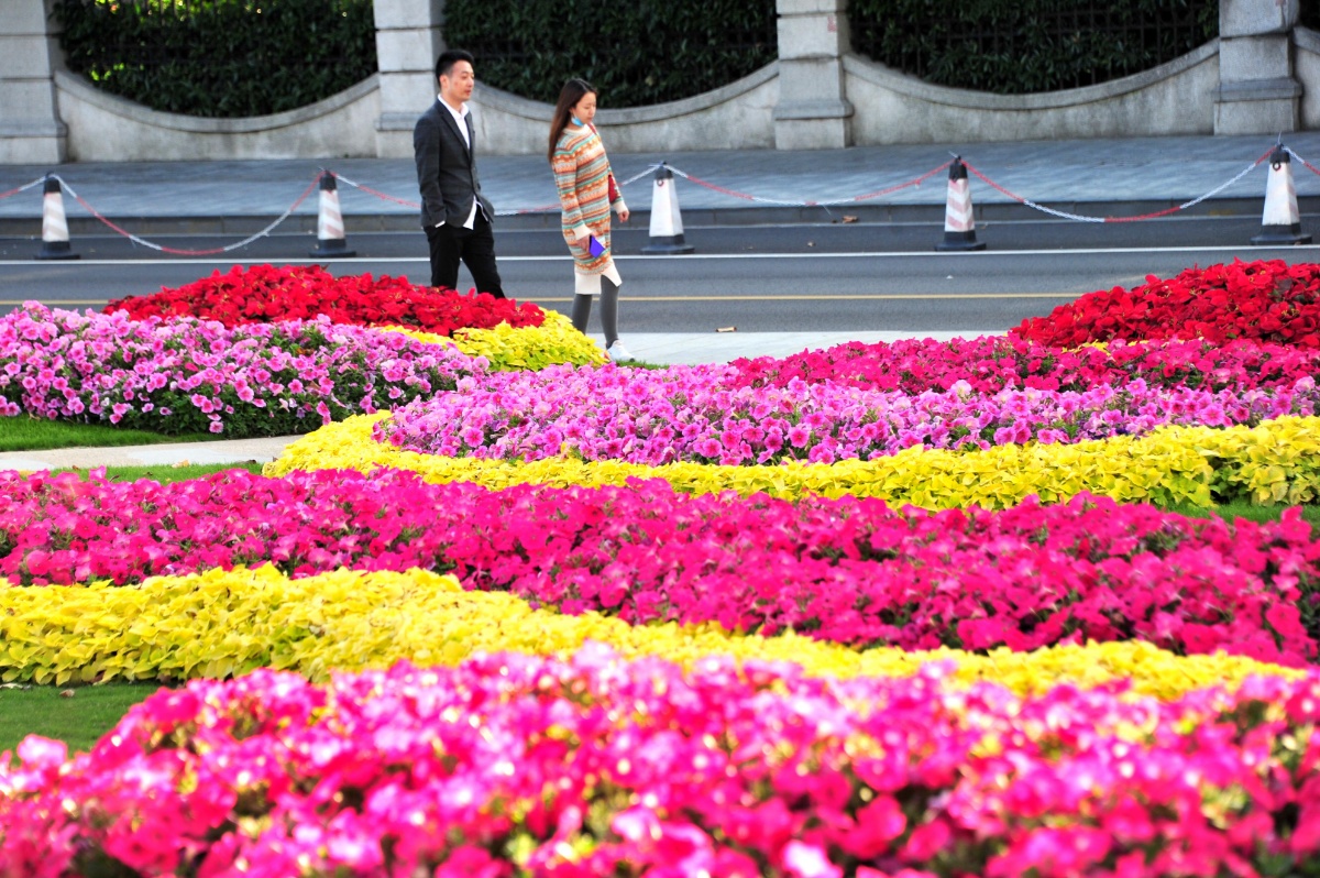 2020年11月3日,上海,沿着南苏州路滨河步道走到外滩,就在外白渡桥边,有一座气质完全不同的花园。这里,原先是一个固定的植物景观,设计者将景观打开,用多种植物构造了一座色彩明艳、美不胜收的“最美花园”。站在新建的钢结构景观桥上赏景拍照,一边是奔向黄浦江的河水,一边是历史感厚重的外白渡桥,上海大厦成为背景,浅咖啡色的建筑,静静地衬托着眼前的姹紫嫣红。隔江的陆家嘴地标建筑群更是展现了东方大都市的绝美景象。人们沿着园中112米长的张爱玲步道蜿蜒漫步,粉黛乱子草和流线、色块形状的花卉图案缤纷镶嵌,与渐渐变色的色叶树融为一体,让人目不暇接。值得一提的是小花园椭圆形的欧式露台不仅新增了两座少男少女的浪漫雕塑,造型独特的艺术插花也别有一番城市园林小品的韵味。
