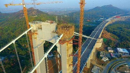 11月11日凌晨,五峰山长江大桥南主塔塔顶鞍罩房最后一次混凝土浇注完成,标志着五峰山长江大桥主体工程已经全部完成。