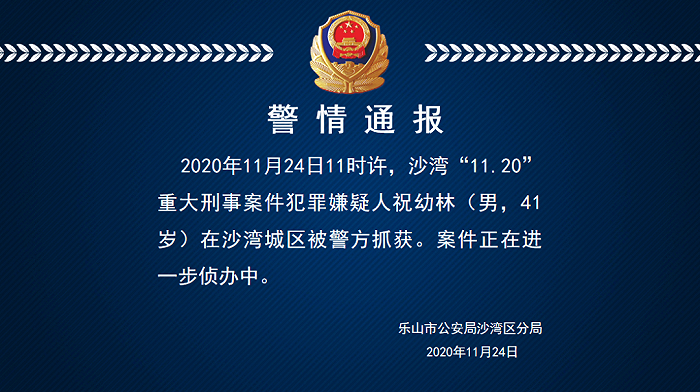 据四川乐山市公安局沙湾区分局微信公众号通报,11月24日11时许,沙湾“11.20”重大刑事案件犯罪嫌疑人祝幼林在沙湾区被警方抓获。目前案件正在进一步侦办中。