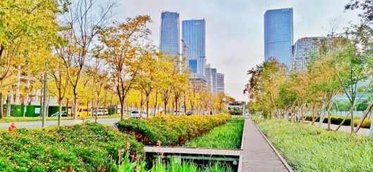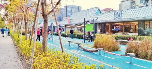 六行行道树,分隔出汽车、自行车以及人行的区域,落叶点染着天蓝色的健身步道,不远处,就是儿童乐园里孩子们的欢声笑闹。这座公园已然成为承载现代生活的跑道。