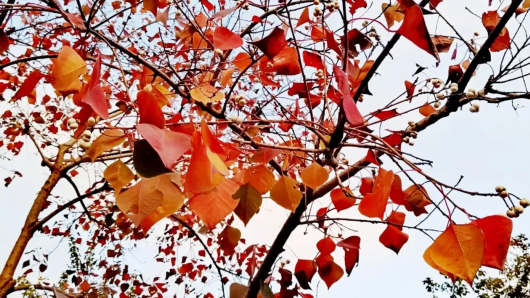 眼下初冬,路旁的银杏落叶翩飞,正在变色的火红乌桕,挂着小小的白色果实,芦苇随风飘摇,平添暖意。