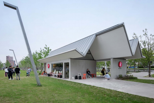 高低起伏的屋顶沿纵向延伸,隐喻着飞机振翼的姿态,呼应着龙华机场的辉煌过往。