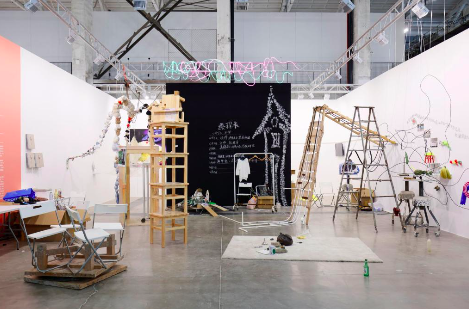 走进展厅,右侧几个格子间分别是中央美术学院壁画系、雕塑系、油画系、版画系四个院系的“创新课堂”。壁画系把材料研究课题搬到展厅,打破课堂和展览的固有模式,还准备了技术材料供师生观众就地创作。雕塑系则把学生日常学习时的作品搬到现场,并根据展厅高度重新布置,一块巨大黑板写着“课程表”,每天会有学生化身教育者介绍研究课题,有通用技术蔬菜种植、非传统恐龙研究等。