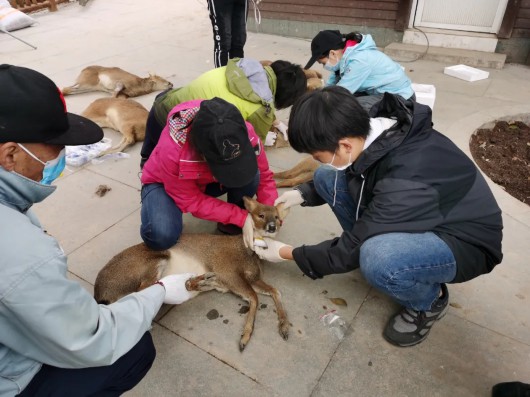 图片说明:工作人员为獐绑上追踪器