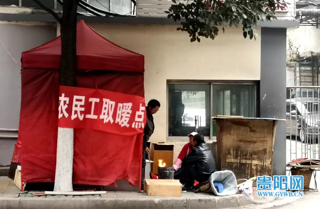 12月23日16时许,在云岩区贵州新华印刷厂出口处,人行道边是一个临时搭建的红色帐篷,棚上横幅写着“农民工取暖点”,有三人正围着火炉烤火等待揽活。