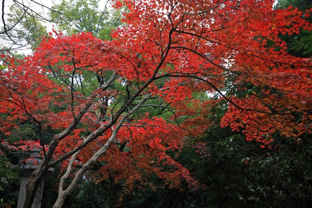 鸡爪槭的样子小巧玲珑,宛如一只只鸡爪降落枝头。不同于红枫的艳红、羽毛枫的明黄,鸡爪槭色调更温和,为宁静的古猗园增添了一丝暖意。