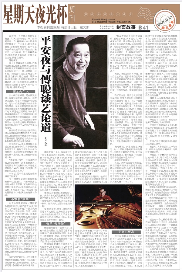 著名钢琴家傅聪因新冠在英国去世,2005年初,星期天夜光杯曾刊登整版封面故事讲述平安夜聚会上作者与傅聪先生的近距离深入对谈,将傅聪先生在音乐和人格上的魅力跃然纸上。