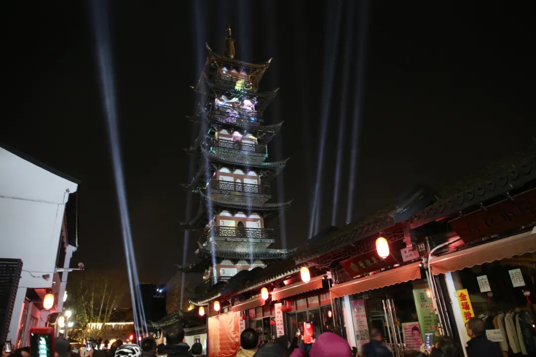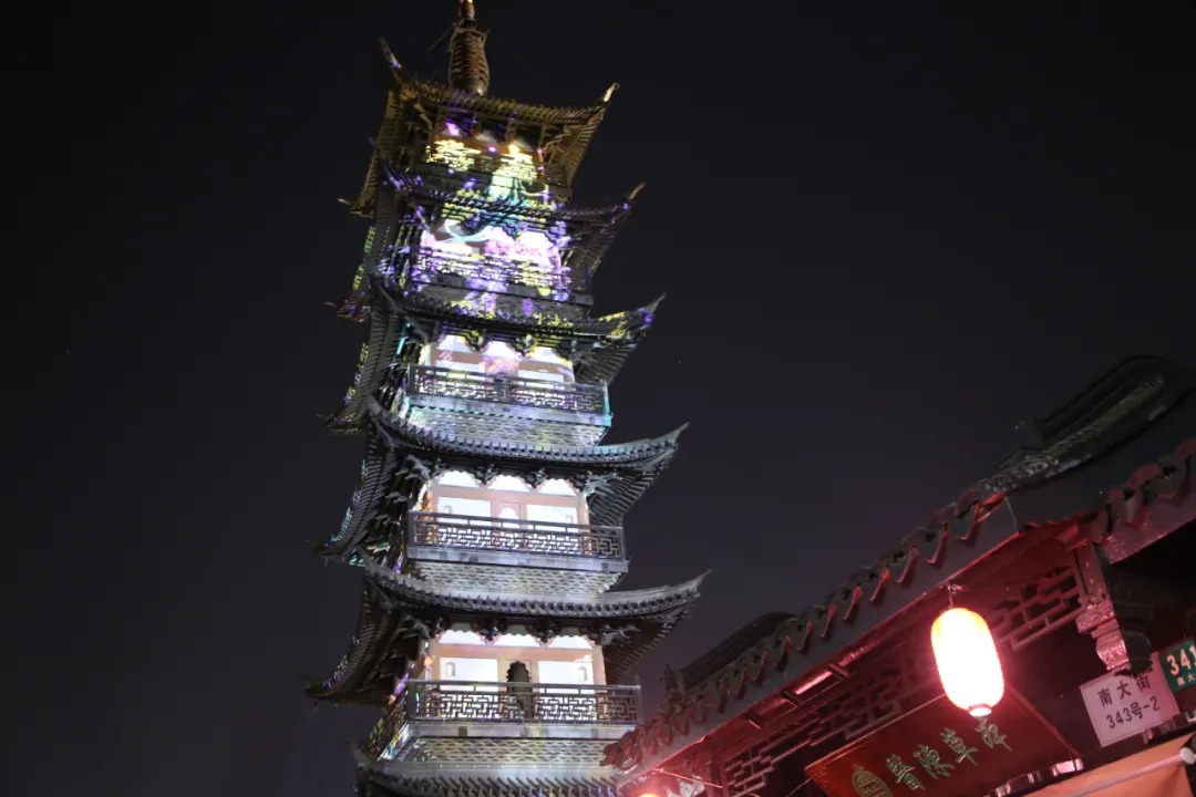 咚咚、咚咚……晚上8点,随着清脆的鼓点声响起以及多彩的灯光照射在法华塔上,一场炫酷的跨年灯光秀正式开启。
