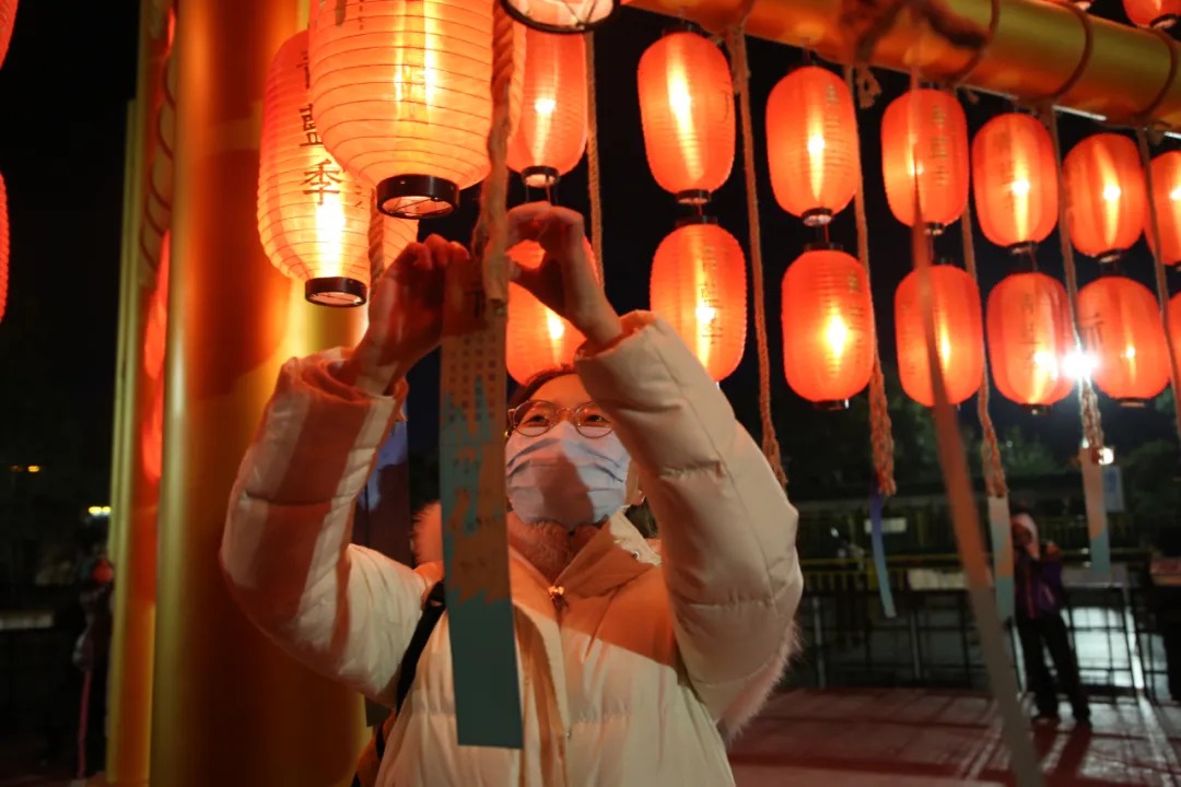 在博乐广场,穿斗结构的祈福装置布满了数百盏大红灯笼,搭配了嘉定“非遗”药斑布、竹刻等衍生出的祈福签,游客在祈福签上写下新年心愿,亲手挂在祈福装置上,祈愿学有所成、事业顺利、家庭美满、身体健康、国泰民安。