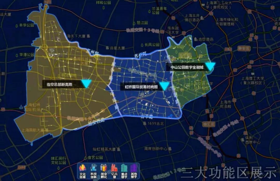 长宁区三大产业功能区对接《上海市长宁区单元规划(2017-2035)》,加强核心功能集聚,优化提升以中山公园商业中心、虹桥国际贸易中心、虹桥临空经济示范区为核心的东、中、西三大功能区功能,通过“三带”协同勾连和TOD社区建设,进一步彰显各展所长、协同共进的综合优势。