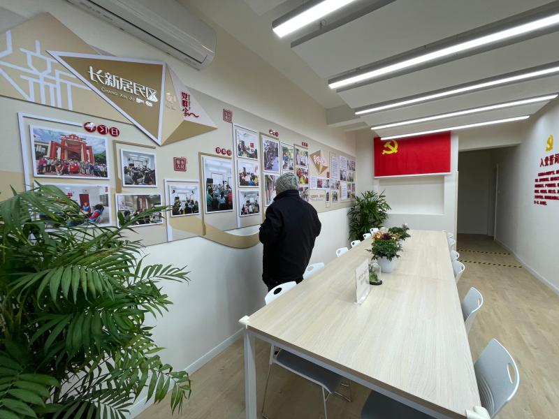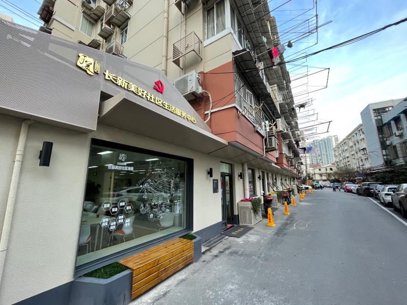位于长新小区主干道的生活服务中心,是小区整体改造提升中的焦点,包含生活中心、便民中心、邻里客厅三大板块。居委会缩小办公空间,整合原有的居委会、警务室、会议室、收储闲置用房等约400平方米的区域,打造了一个一站式的家门口服务站点,成为居民生活的新型“便利店”。