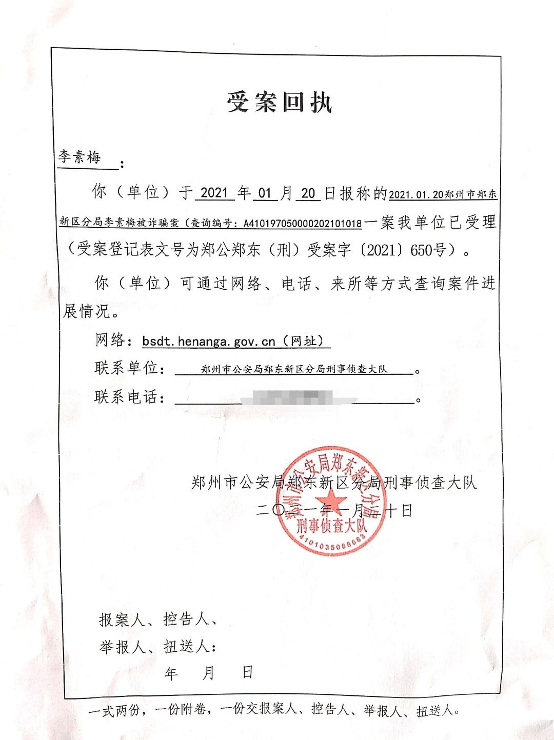 2月18日,记者从周兆成律师处了解到,“河南女老板投资明星演唱会1200万被骗”案有了最新进展,就张琳琳等人涉嫌诈骗一案,女老板李素梅向郑州市公安局郑东分局提起了刑事控告,该局出具《受案回执》表示受理,目前正在等待警方立案。