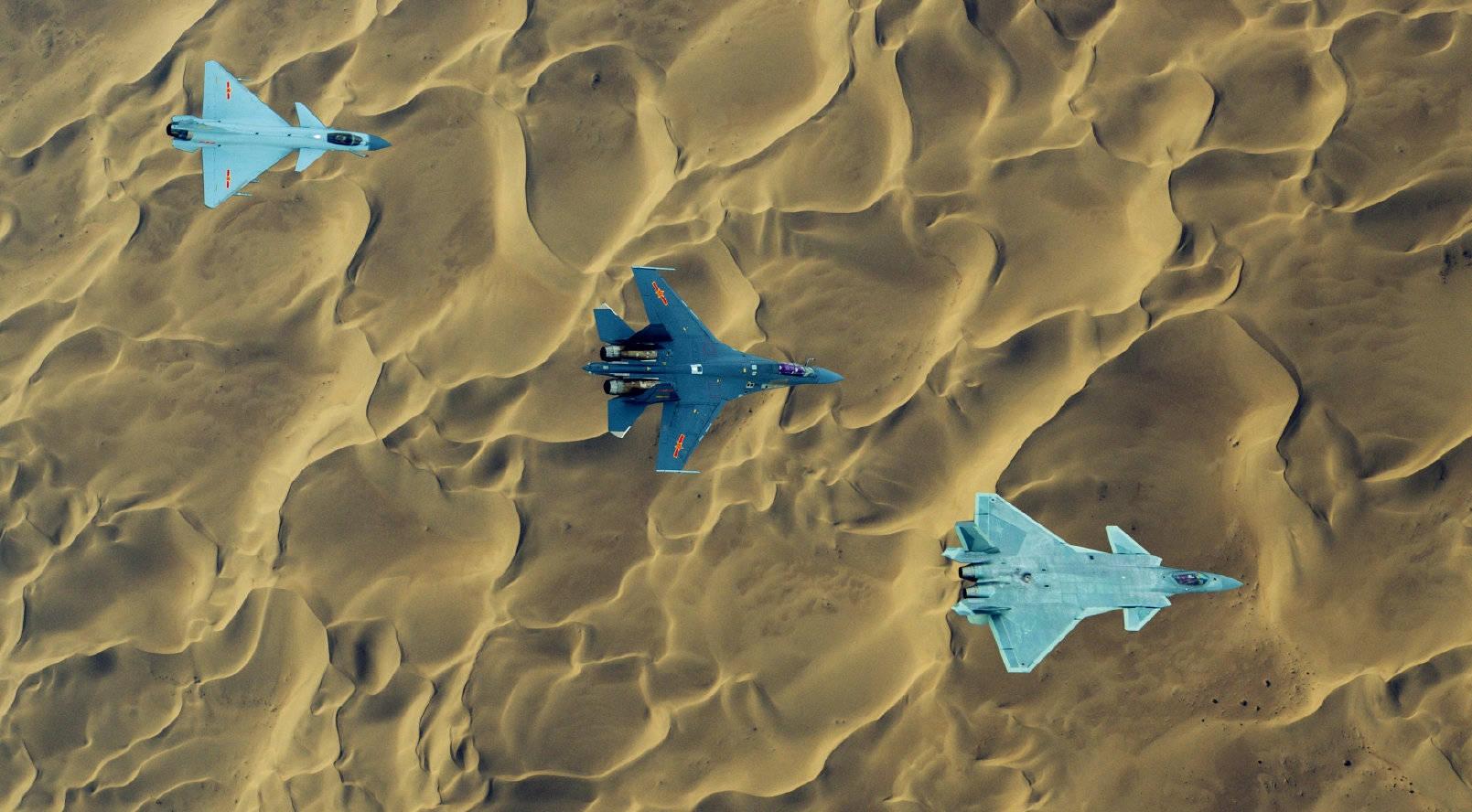 图片说明:新一代解放军“空中三剑客”(从左至右,歼-10C、歼-16和歼-20)