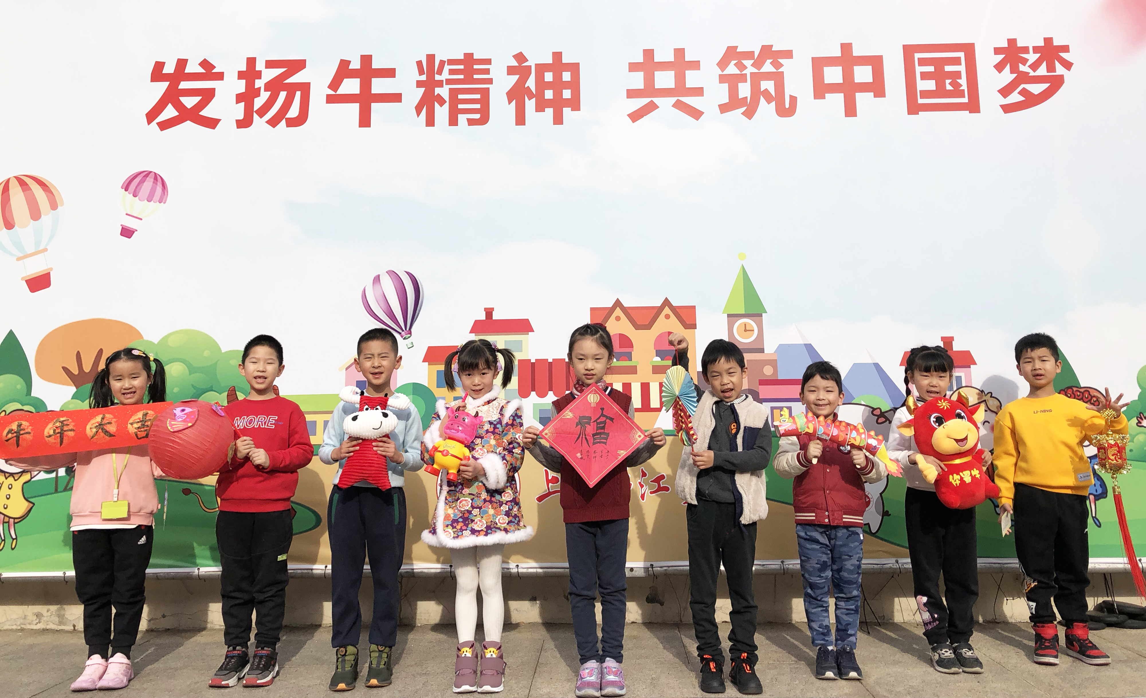 “牛年来,牛年到,昂起牛角,勇争先;甩起牛尾,扫困难;扬起牛蹄,勤锻炼;鼓起牛劲,爱学习;张开牛口,多交流;一身牛气朝前迈,牛年韧如牛!……”今天,江宁学校一二年级明山校区的孩子们身穿漂亮新衣,手提小牛灯,拿着红福字和新春对联,纷纷用儿歌等形式送上新学期祝福。