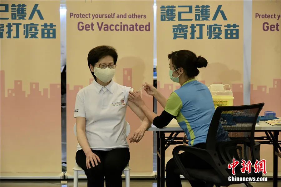 林郑月娥接种疫苗后会见传媒时表示,希望官员和立法会议员率先接种新冠疫苗能够起到示范作用,鼓励全港市民从护人护己、爱家人、爱社区、爱香港的角度积极参与疫苗接种。