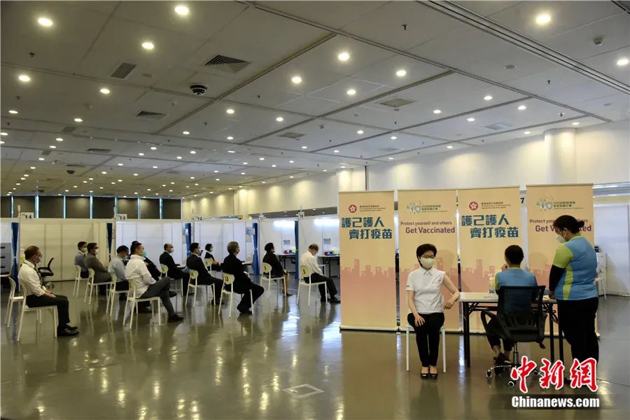 香港特区行政长官林郑月娥、特区政府主要官员、特区行政会议成员、特区立法会议员2月22日下午在设于香港中央图书馆展览馆的社区疫苗接种中心陆续接种科兴新冠疫苗。