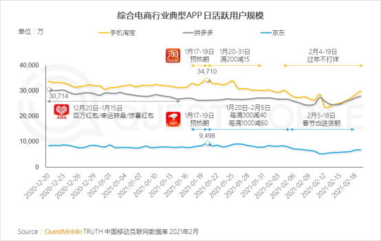 报告数据显示,拼多多APP的日活跃用户数(DAU)在大年初一和初二(2月12日和2月13日)两天,首次超越手淘。