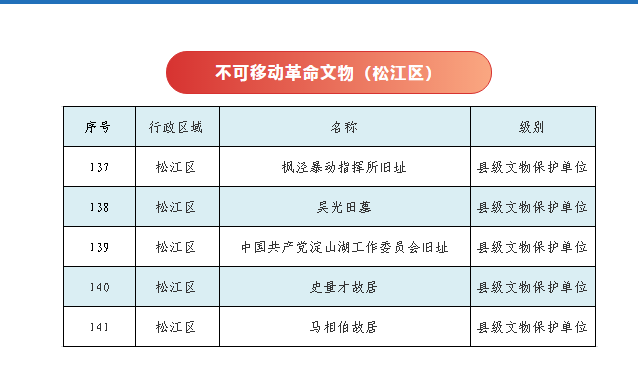 日前,上海市文旅局公布了《上海市第一批革命文物名录》,其中包括150处不可移动革命文物,松江共有5处入选,分别是枫泾暴动指挥所旧址、吴光田墓、中国共产党淀山湖工作委员会旧址、史量才故居、马相伯故居。不可移动革命文物(松江区)