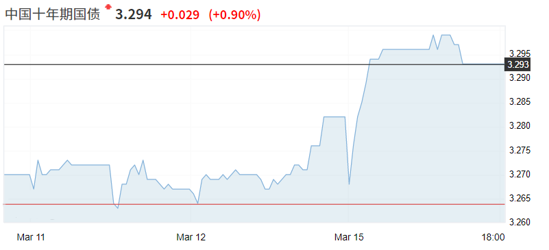 截至收盘,十年期主力合约跌0.15%;五年期主力合约跌0.11%;二年期主力合跌0.03%。早盘时间,中国十年期国债收益率曾一度跳升,从3.268跳升至3.294上方。