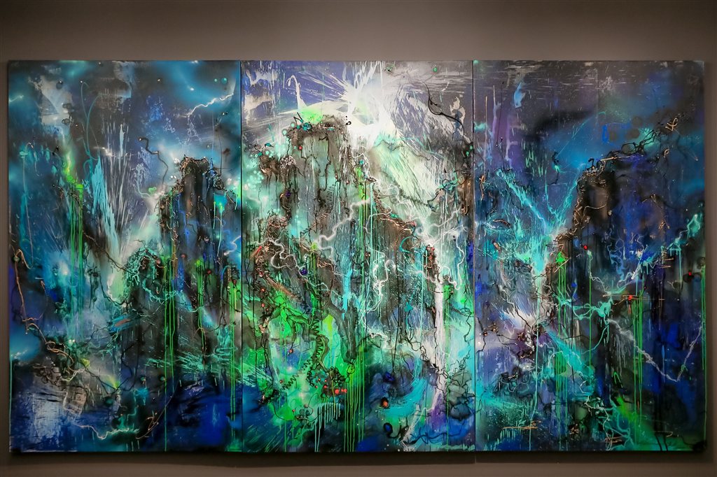 “没有足够的距离——跨界潮流艺术展”展出了陈英杰创作的《自然重力》《2020刺穿束缚·中国龙》《再造乾坤——第十四号》《突击》等作品。其中2020年全球疫情爆发期间创作的“自然重力”系列,用颜料间的碰撞和爆发来表现人与自然间的矛盾冲突,反思人与自然的关系。同在2020年创作的“刺穿束缚·中国龙”系列作品,他从李小龙的武术哲学汲取灵感,在东西方绘画语言里试图建立一种无冲突的境界,中国龙以一种无形流动的形态在世界文化的浪潮里乘风破浪。陈英杰说:“这次参展的作品展示了自己近几年的创作系列对自然、动物、传统民族文化与时尚潮流关系的探索。”