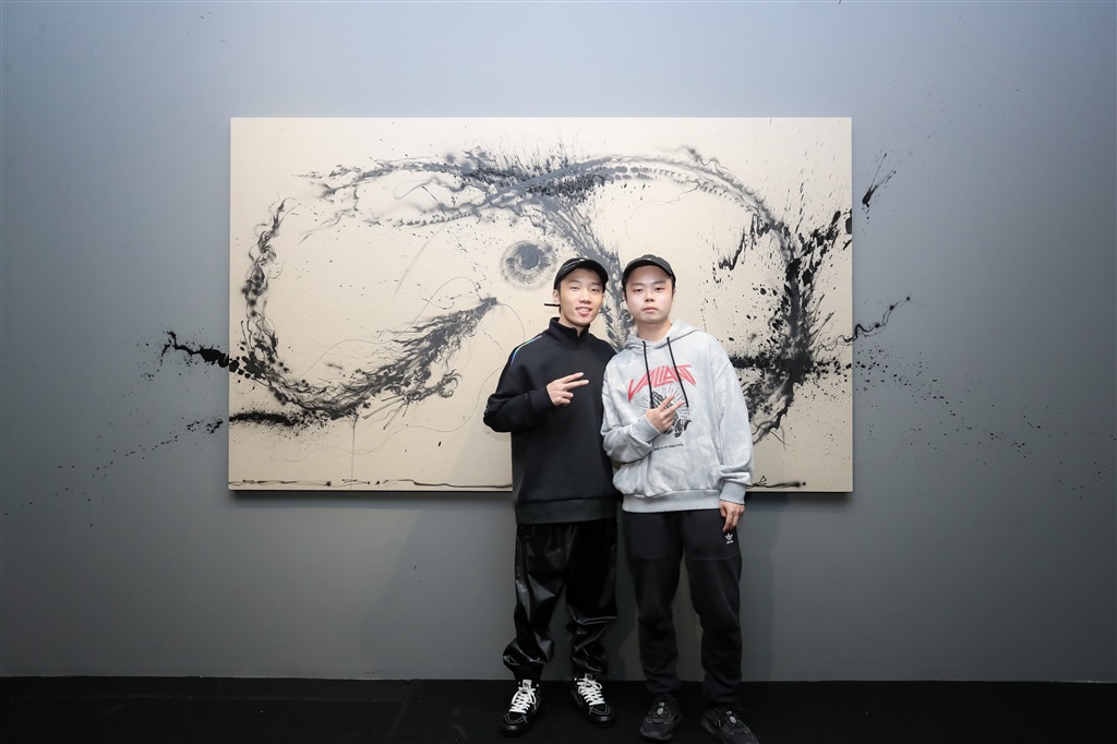 视觉艺术家陈英杰(画图男)与电子音乐制作人Anti-General在明珠美术馆现场跨界合作完成的《2021 刺穿束缚·中国龙12号》前合影