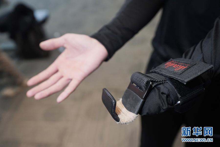 3月19日,冬残奥会国家集训队单板滑雪运动员纪立家在运动员驻地进行体能训练时展示他穿戴的俗名“钩子”的辅助器械。新华社记者 才扬 摄
