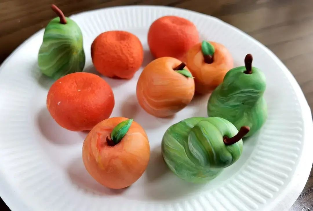 同学们在学习与操练中,渐渐地掌握了面塑的窍门,做出一只只色泽饱满、鲜艳靓丽的苹果、橙子、梨等作品。