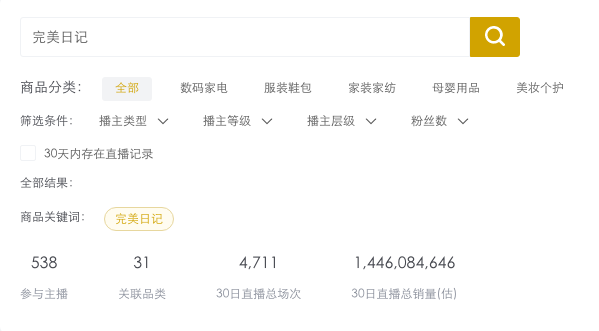 澎湃新闻记者查询淘主播数据分析平台“灰豚”的数据,截至目前,完美日记仅在30天内的天猫渠道的带货主播就有538名,近一月内共参与直播4711场次,预估当月直播销量有14亿元。