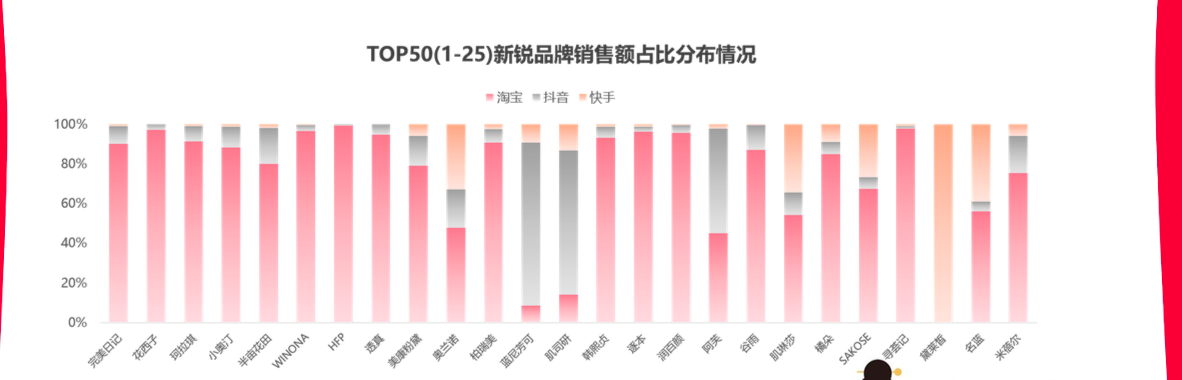 根据市场研究数据平台“果集数据”,2020年在淘宝、抖音、快手三大直播平台中,新锐品牌贡献的销售额占到三分之一,且在这29.4%的占比中,达到95%的新锐品牌位列TOP100;而在品牌量上来看,TOP100中的新锐品牌有17家。这就意味着,直播时代的到来,新锐品牌拥有更多出圈的机会。