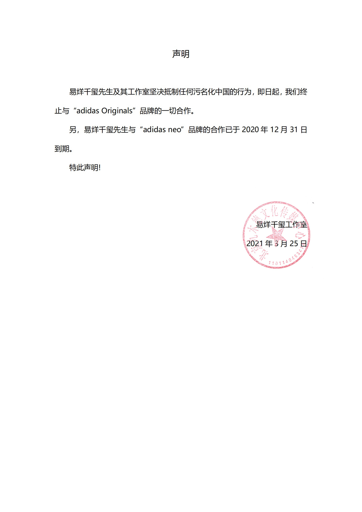 3月25日,艺人杨幂、迪丽热巴、易烊千玺工作室官方微博分别发表声明称,终止与阿迪达斯(adidas)品牌合作。
