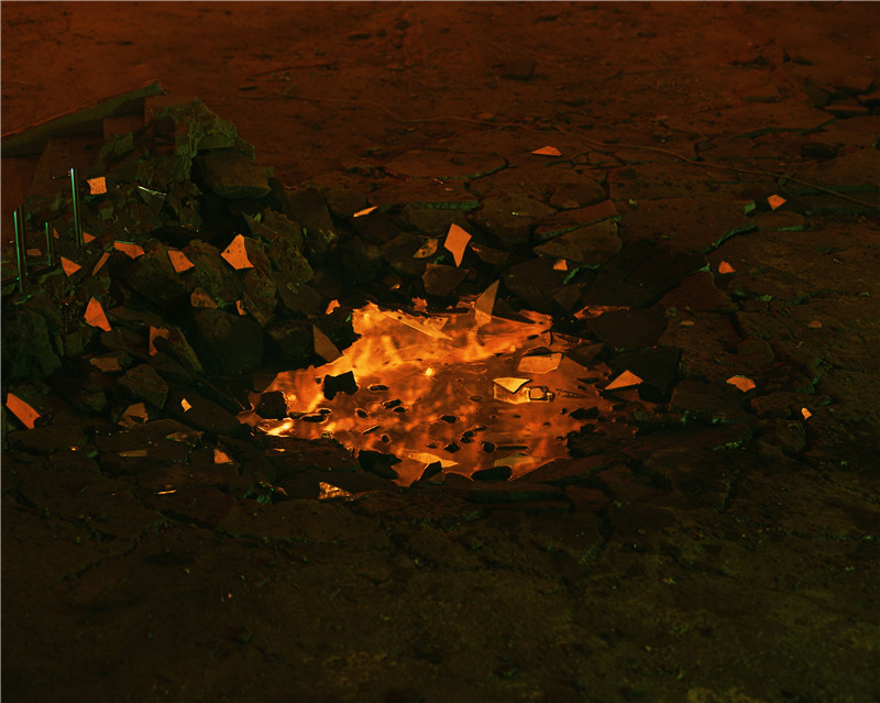 城市在现代化的推动下不知疲倦地新陈代谢——纵向上拔地而起,横向上四面出击。陈维不断捕捉、重访、截取和再造这些转瞬即逝的“城市场景”。“新城”计划正是对这些裂隙的回应——被撕扯开的工地金属护墙板,熠熠生辉地倒在人行道上(《铁皮》,2015年),积水的建筑深坑散落着玻璃渣,反射出来自夕阳或华灯的流光(《玻璃湖》,2016年),行人道地砖破损处裸露的地基,浮起炫目的金黄(《新露》,2017年)……那些未能等到理所应当的竣工的城市化残骸,在记忆中还来不及存档就被刷新了。