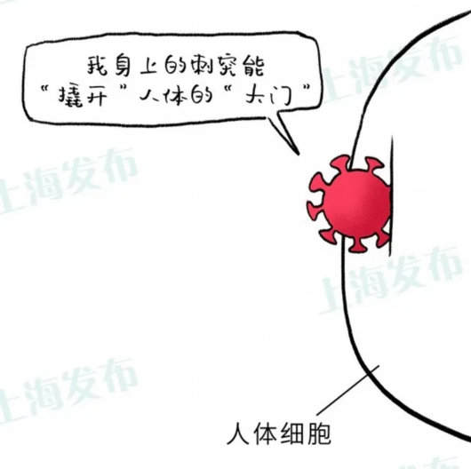 “我”遇到人类后,就会找机会通过S蛋白与人类的细胞表面受体ACE2结合,长驱直入。