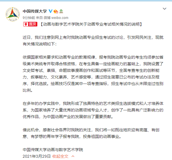 据中国传媒大学官博消息,3月29日,动画与数字艺术学院关于动画专业考试相关情况的说明发布。以下为全文:
