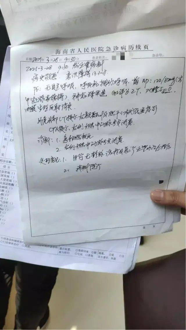 从3月28日,海南省人民医院急诊开具的诊断书显示——“呼吸心跳骤停,大面积急性脑梗死,无自主呼吸”。期间,李女士多次被送入抢救。3月30日凌晨,李女士再次送入抢救后,因抢救无效不幸离世。