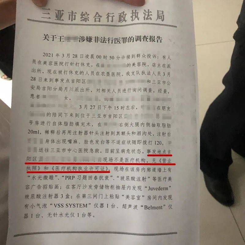 今天上午,记者联系到了三亚市综合行政执法局,了解到执刀医美手术“医生”王某华并不具备行医资格,她所谓的工作室也没有相关营业执照。她只是在广州培训过并取得高级美容师资格。29日,执法人员对王某华下达文书,要求其不得擅自开展医疗美容执业活动。同时,王某华涉嫌非法行医罪,案件已经已送公安机关查处。