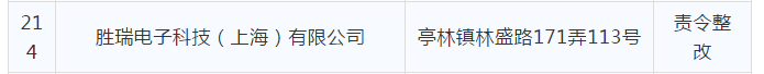 另据资料显示,2020年10月16日金山区市场监督管理局对胜瑞电子进行检查,检查结果为要求该公司加强管理,确保安全。