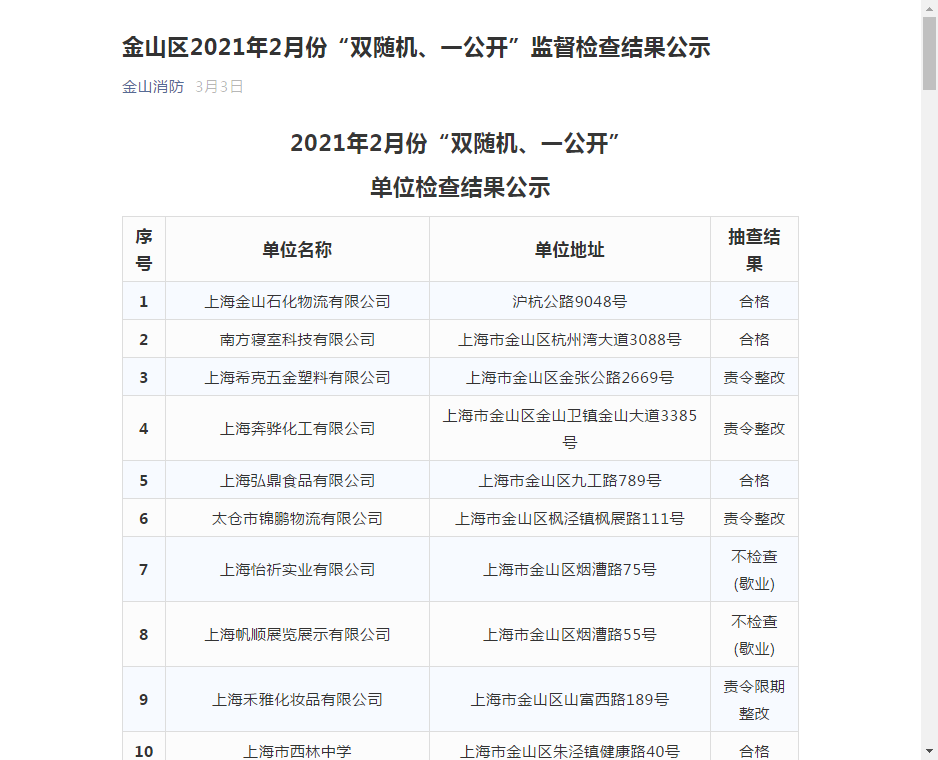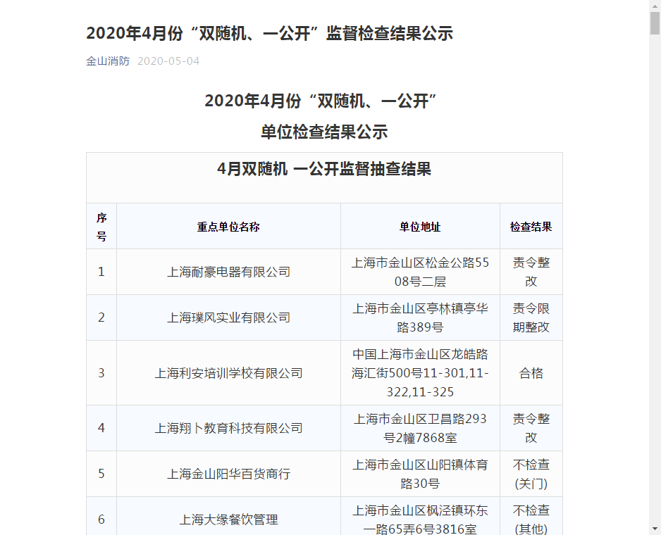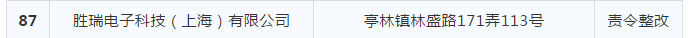 此外,在金山消防2020年4月“双随机、一公开”单位检查结果公示中,胜瑞电子科技(上海)有限公司同样被要求责令整改。