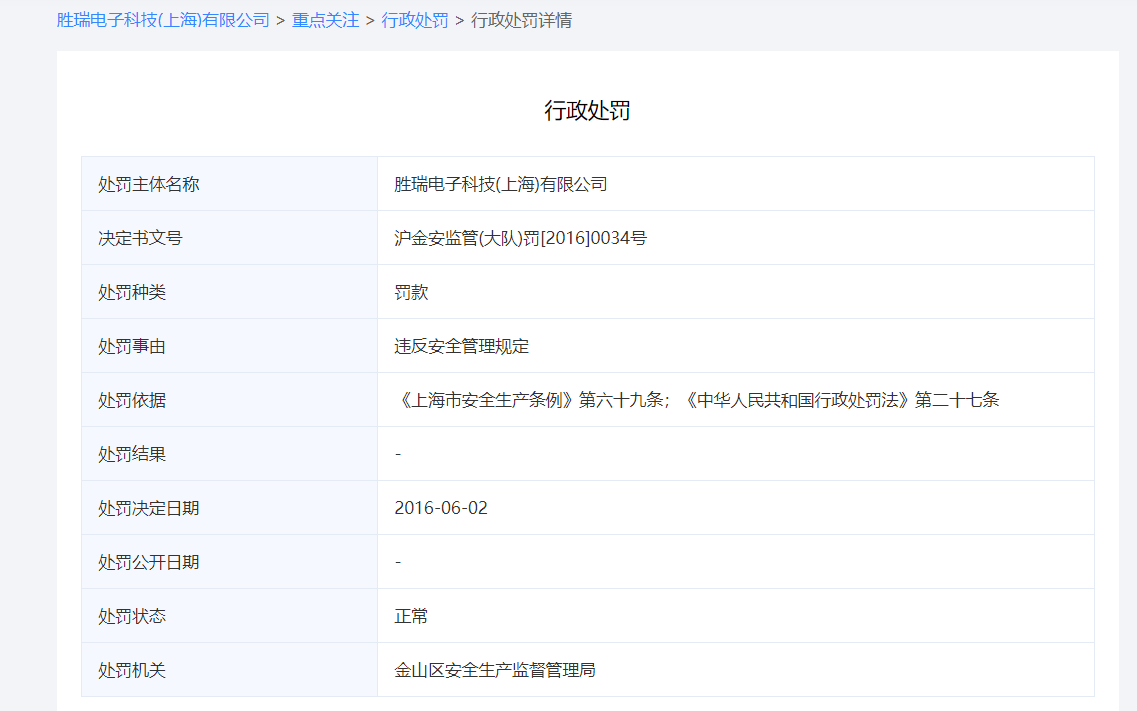 2016年10月,胜瑞电子曾因违反大气污染防治管理制度,被上海市金山区环保局责令停止生产或者使用,并处罚款。
