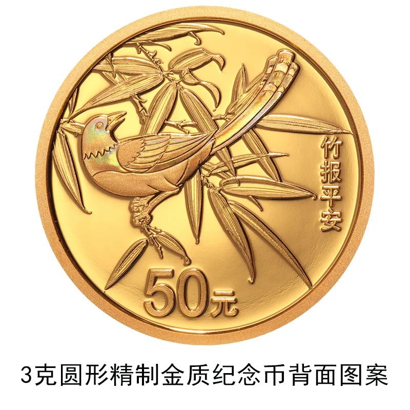 3克圆形金质“竹报平安”纪念币(5月20日发行)背面图案为喜鹊与竹子枝叶组合图案,并刊“竹报平安”字样及面额。