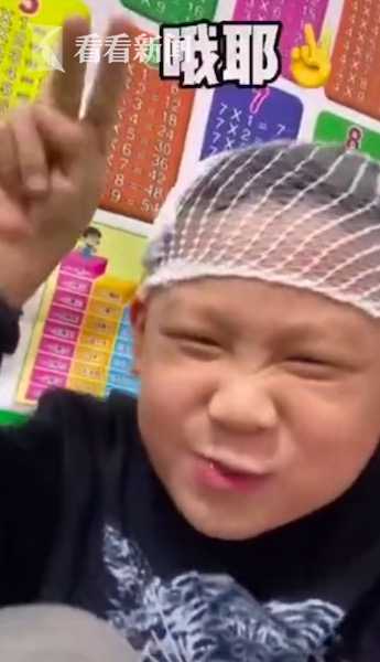 视频中,男孩指着自己受伤的脑袋说“老师,我受伤了,请两天假,医生说我不能动脑,有个口子,出了老多老多血。”说完还问妈妈有没有录完,得知录完后,一改之前没精神的样子,突然嘚瑟起来并摆出“耶”的手势。